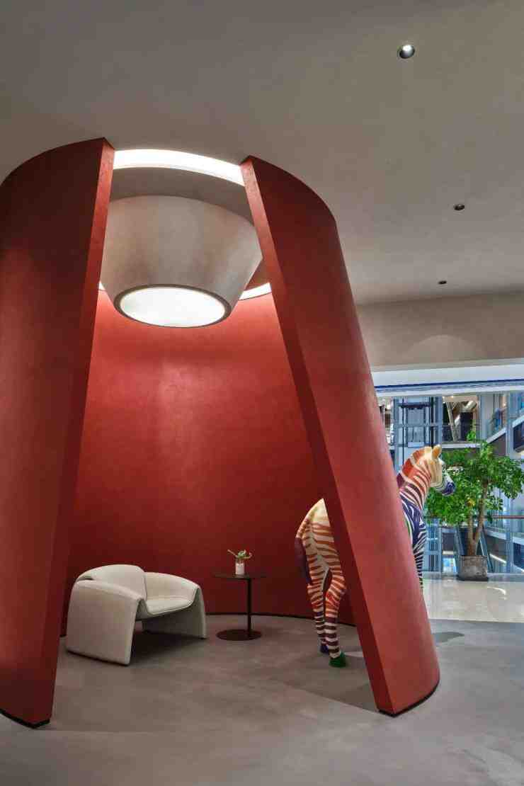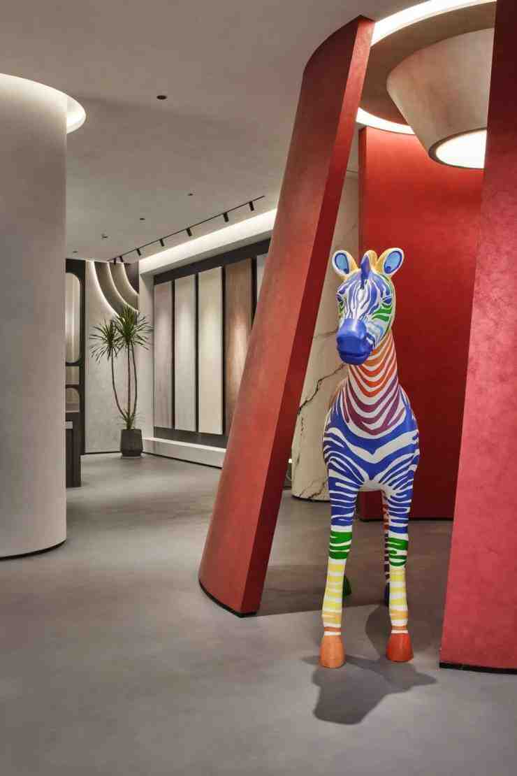 由伟壮老师带领设计师团队,重塑空间和色彩,他们通过线面不同形态的交互表现,构筑的是一种内在的情绪关连与艺术氛围。入口处名为「爱的漩涡」一堵高大的艺术红墙,以及使人联想到意大利尤文图斯队的「彩色斑马」打破了枯燥无味的秩序感,让整个店面增添了热情洋溢的生命力,拉近了人们与品牌间的距离感。