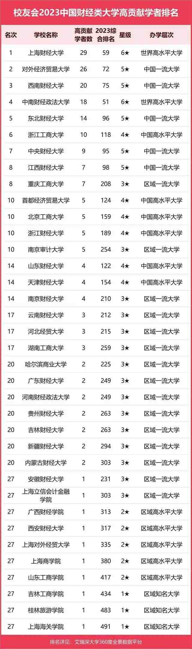 榜单显示,在最新校友会2023中国高贡献学者榜单中,上海财经大学教师的教学科研贡献能力最强,有29位学者上榜,雄居校友会2023中国财经类大学高贡献学者排名第一。对外经济贸易大学26位,位居第2。西南财经大学20位,居第3;中南财经政法大学18位,列第4;东北财经大学14位,居第5。位居前10强的其他大学为浙江工商大学、中央财经大学、江西财经大学、重庆工商大学、首都经济贸易大学、北京工商大学、浙江财经大学、南京审计大学等高校。 校友会中国高贡献学者榜单首发于2022年,是目前国内唯一从“教学科研贡献”角度遴选中国高校优秀学者的榜单。中国高贡献学者遴选以中国学者对国家经济社会发展做出的系统性成就和贡献为基准,从教育教学、学术研究和社会服务等多个角度19项评价指标遴选中国高校的杰出学者,这是与中国高被引科学家、高被引学者仅从纯论文影响角度评价学者最大的不同。 艾瑞深中国双一流建设评价课题组首席专家、中南大学蔡言厚教授指出,校友会中国高贡献学者评价遴选标准完全符合国家“双一流”建设方针政策精神,遴选评价指标均是校友会中国大学排名高层次人才评价的核心指标,对中国高校评价、培育和引进人才具有重要的参考价值,为科学客观系统评价研究分析中国高校学者的表现提供依据。首届榜单引起了社会各界的强烈反响,遴选结果得到学界的普遍好评和高度肯定。