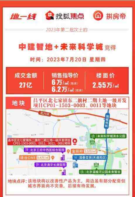 上周昌平北七家地块和高教园地块都已经名花有主了,北七家地块由于拍地文件中的特殊要求只有一家房企报名,最终被中建智地+未来科学城底价拿下,地块属性容积率1.3控高24米,将来也是以低密改善产品为主,该地块西边有首都师范大学附属中学,东边靠近京承高速北七家收费站,周边多以别墅类小区居多,城市界面算不上很好但也没那么次,将来有改善自住需求的可以看看这儿.