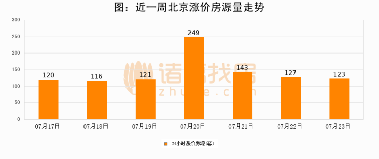 根据诸葛找房数据显示,北京24小时涨价房源量为123套,较07月22日减少4套,环比下降3.1%。与此同时,涨价房源占比小幅回落,对于购房者来说是一个入市窗口期,购房者可抓住时机入市。