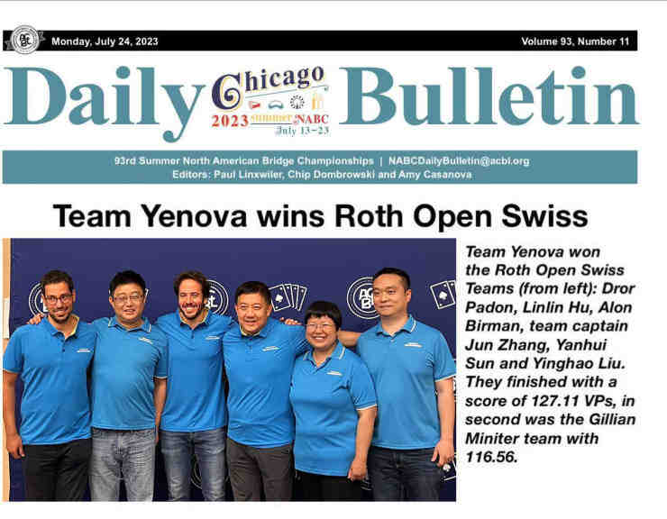在北美桥牌夏季大赛主赛斯平果尔德杯16强赛惜败于美国传统强队Wolfson队后,业之峰队马不停蹄的参加了为期三天的另一夏季大赛重要锦标——Roth杯瑞士制团体赛的比赛。共有142支队伍参加了这项比赛的角逐,每天会淘汰一半的队伍。