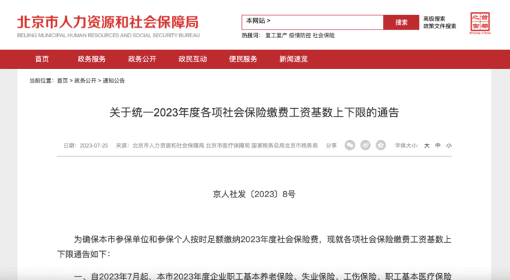 7月25日,北京市人力资源和社会保障局、北京市医疗保障局、国家税务总局北京市税务局联合发布《关于统一2023年度各项社会保险缴费工资基数上下限的通告》。