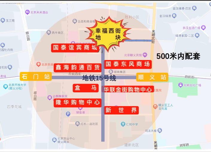 为了给大家展示得更加具体,我们前两天还特意去现场实地勘查了一下。毫不夸张地说,出行是真的很便利,几乎用不上什么交通工具,几分钟的路看见了华联、新世界、隆华、国泰四个大型商业,轻松满足日常消费需求;旁边紧挨着幸福幼儿园、光明小学、顺义八中,家门口的一站式菁英教育;走500米就到了15号地铁顺义站,出门自在随心。回来路上,我们还看见了潮白河和顺义医院,这配套堪称“王炸”!