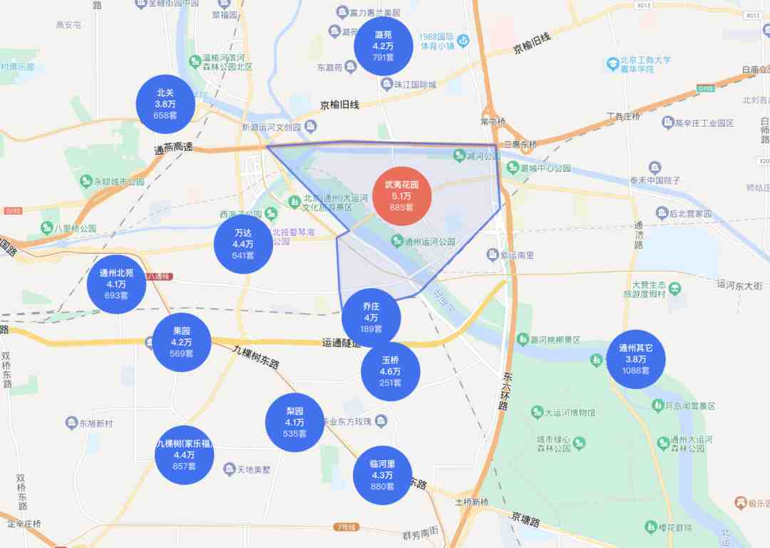 1、通州第一板块——武夷花园这个板块讲过很多次,运河商务区、通州政务区两大功能区,双重外溢加持,学校、生活配套都不错。通州最硬核的板块,最有潜力板块,没有之一。打算在通州买房,武夷花园一定是必看板块,买不买另说。目前武夷花园板块二手房挂牌均价通州区最高,在5.1万/平。