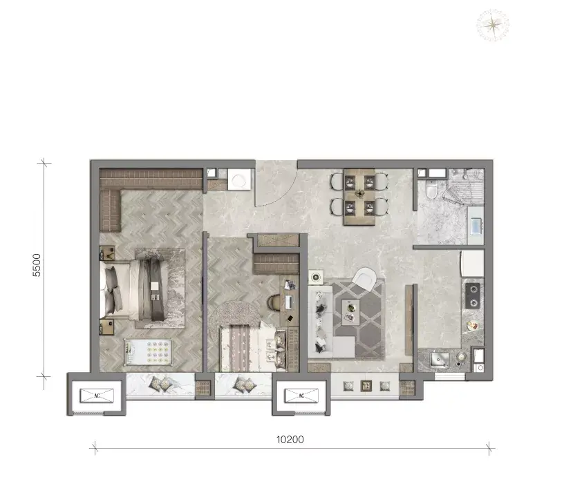 74平两居做到了南向四面宽,客厅+双卧+南向厨房,总面宽约10.2米。但户型图没尺寸,大概率每个房间都会比较拥挤。