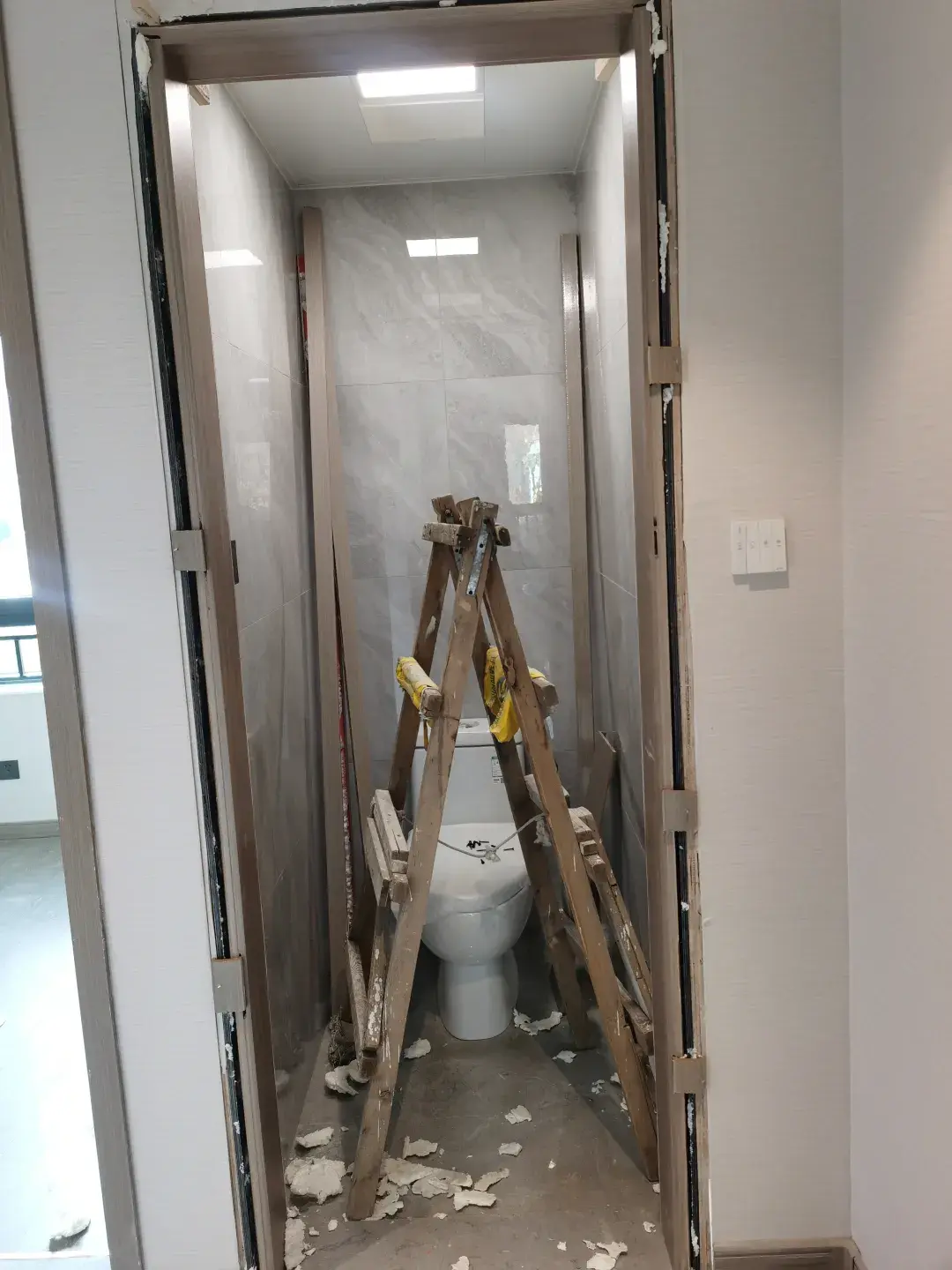 样板间还在装修中,进门左拐,只有一个马桶的客卫赫然出现。