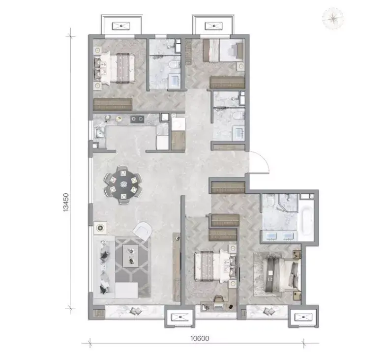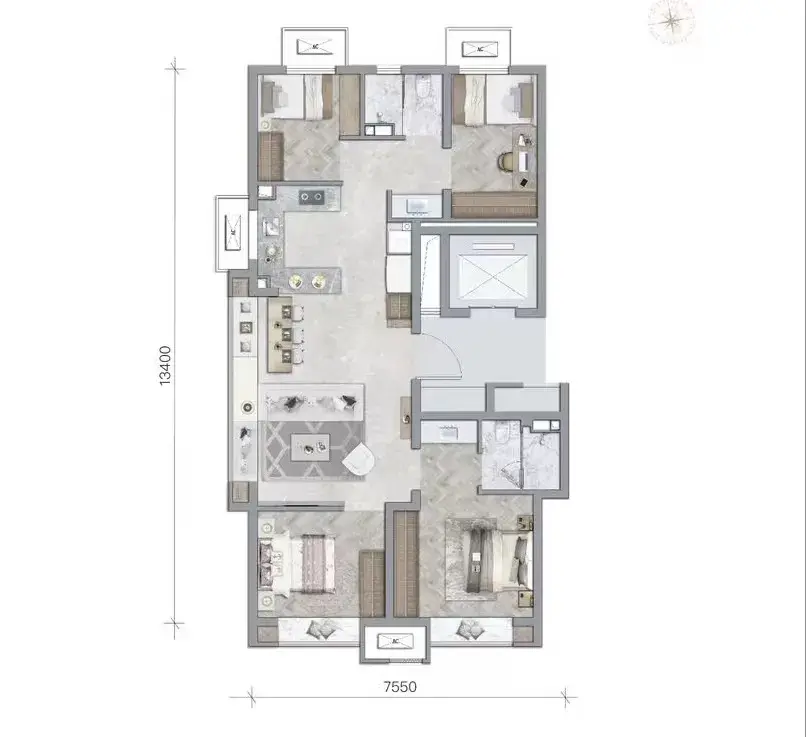 159平是项目最大面积户型,有硬伤:南北不通透+13.45米的长进深+双暗卫。