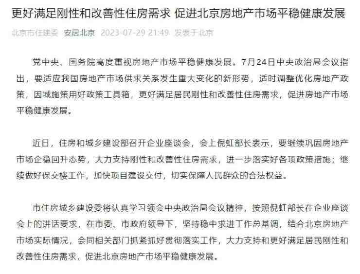 7月29日晚,北京市住建委官方公众号“安居北京”发布消息称,北京将更好满足刚性和改善性住房需求,促进北京房地产市场平稳健康发展。