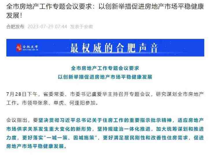 7月28日下午,合肥市召开房地产专题会议,明确要抓紧完善十项工作举措。