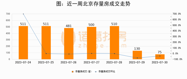 从存量房来看,2023年07月30日北京存量房单日成交75套,比昨日减少55套,环比下降42.3%。从近一周存量房成交来看,北京存量房日均成交套数为388套,07月30日单日成交75套,低于近一周平均水平80.7%。