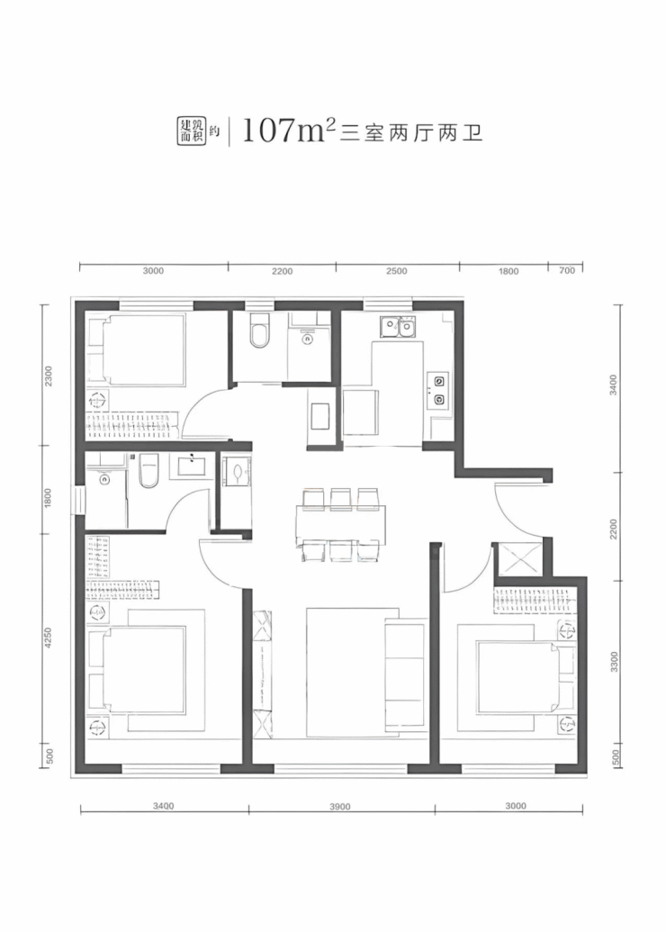107平米三居,南向三面宽,户型方正全明;客厅面宽3.9米,主卧套房设计,南向次卧面宽3米,总价大约664万起。