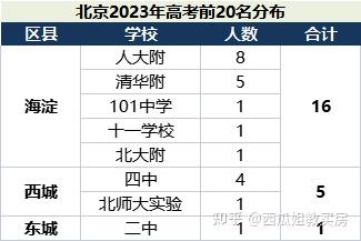 从网传的今年高考前20名的学校,东西海各区人数大概如下,海淀16人,西城5人,东城1人。