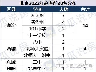 对比去年北京高考前20名学校,海淀、西城人数今年有所上升,朝阳今年没有入围。