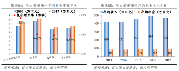 下表还可以发现,2006- 2016 年日本三大都市圈月均租金增加不明显,复合增速在 0.6%左右,同时, 2013-2017 年的平均年租金收入比为 20%,租户租金压力不算大。
