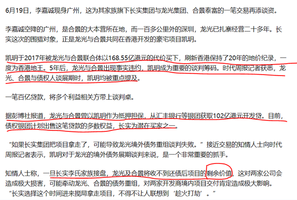 这个问题的核心就是长实很可能把这两个债务违约(也就是暴雷)房企位于香港的最优质资产要拿走了,而且是从银团那里买这两个房企抵押给银团的资产凯玥,这两家公司后面不好和境外债权人谈债务重组、展期之类事宜。