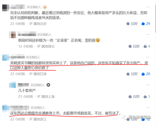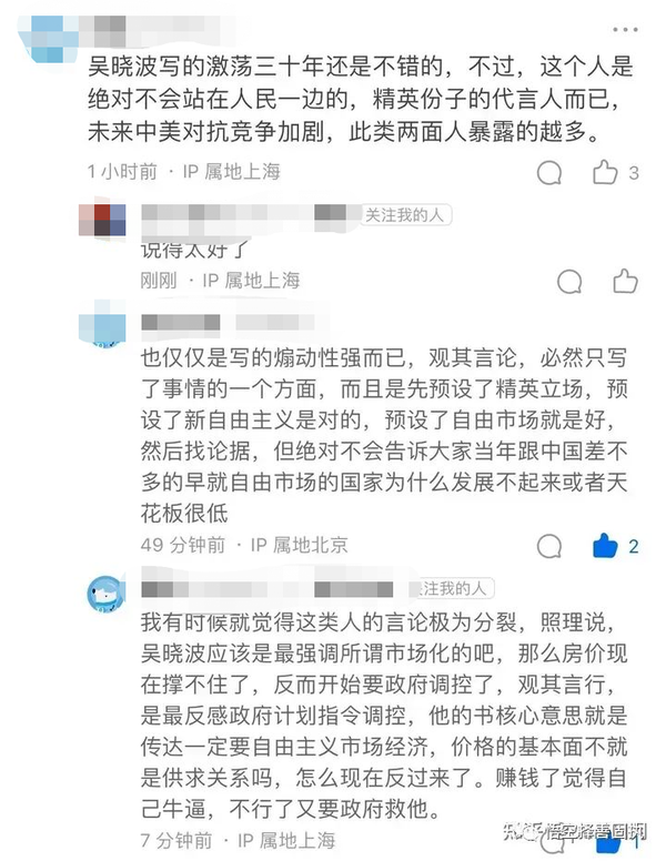 吴那篇文章彻底揭露吴晓波唯利是图自私自利资本家嘴脸(他现在资本确实也够资本家标准),这群人有家无国,只想着自己利益的人而不管大多数普通人利益,只要自己房子不降价、资产不贬值,国家前途命运无所谓的家伙,毕竟他们可以携巨资遁走他国,继续过纸醉金迷的生活,而不管祖国人民水深火热。