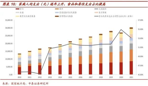 从2013年开始,家庭人均支出中食品和居住所占的比例提升至50.7%,首次超越50%,随后在2020年增长至55%。