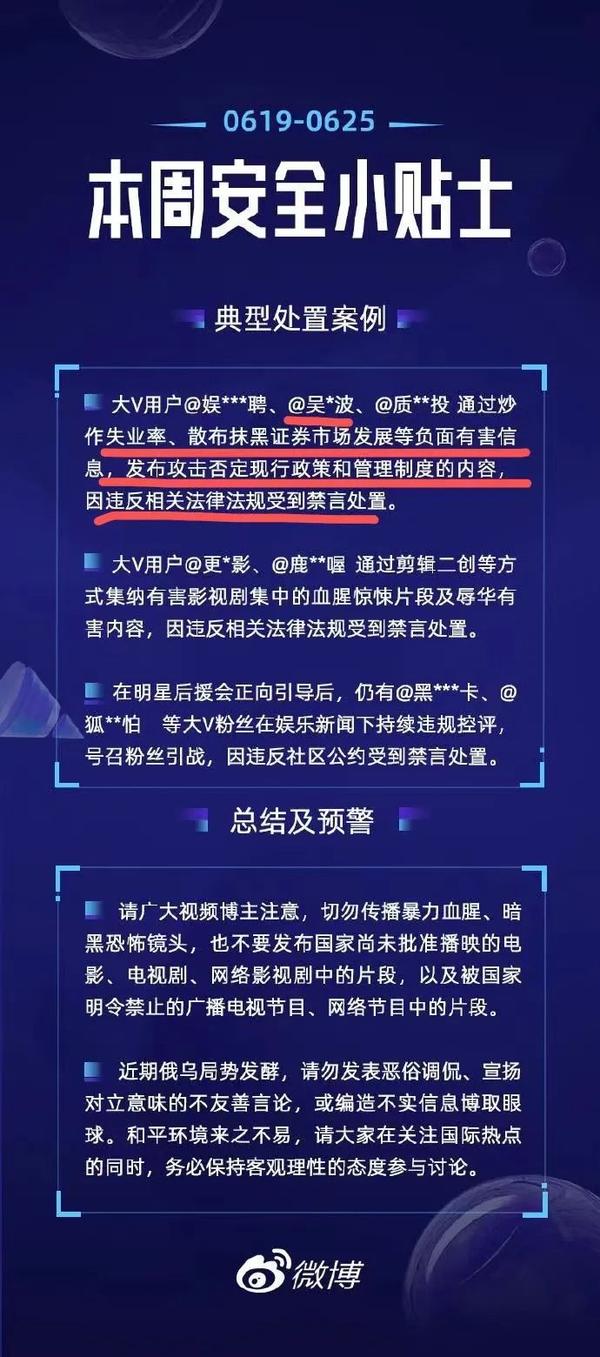 背景资料:6月26日,微博管理员发布的本周创作安全小贴士中显示,大V用户@娱***聘、@吴*波、@质**投 通过炒作失业率、散布抹黑证券市场发展等负面有害信息,发布攻击否定现行政策和管理制度的内容,因违反相关法律法规受到禁言处置。