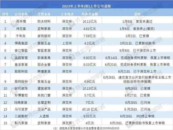 随着行业成熟度的提高,家居行业的资本化进度也在不断向前推进,越来越多企业上市融资,将催化产业格局的结构性变化。据搜狐焦点家居不完全统计,2023年上半年约有15家家居企业更新A股市场上市进程,涉及定制家居、智能家居、系统门窗等多个领域。