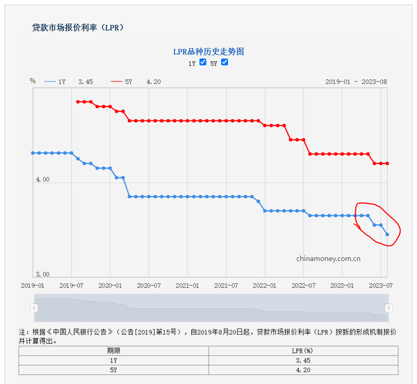 背景:中国人民银行授权全国银行间同业拆借中心公布,2023年8月21日贷款市场报价利率(LPR)为:1年期LPR为3.45%,相比上月下降10BP;5年期以上LPR为4.2%和上月持平,二者降幅均低于市场预期。