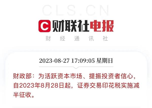 【背景】财政部消息,为活跃资本市场、提振投资者信心自2023年8月28日起,证券交易印花税实施减半征收。