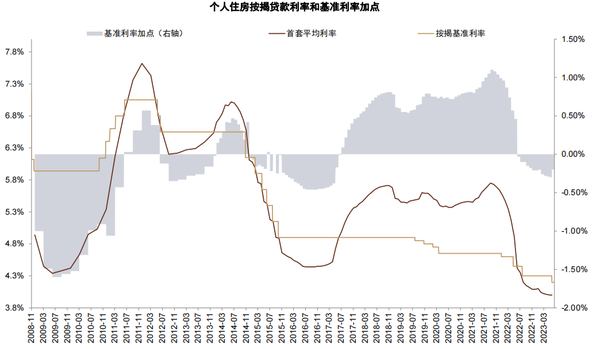 如下图所示,本次存量首套房贷利率下调主要是给2018-2021年高位买房的家庭,2018-2021年首套按揭贷款利率相比基准利率上浮最高约100BP,平均也是上浮80BP,也就是0.8%。