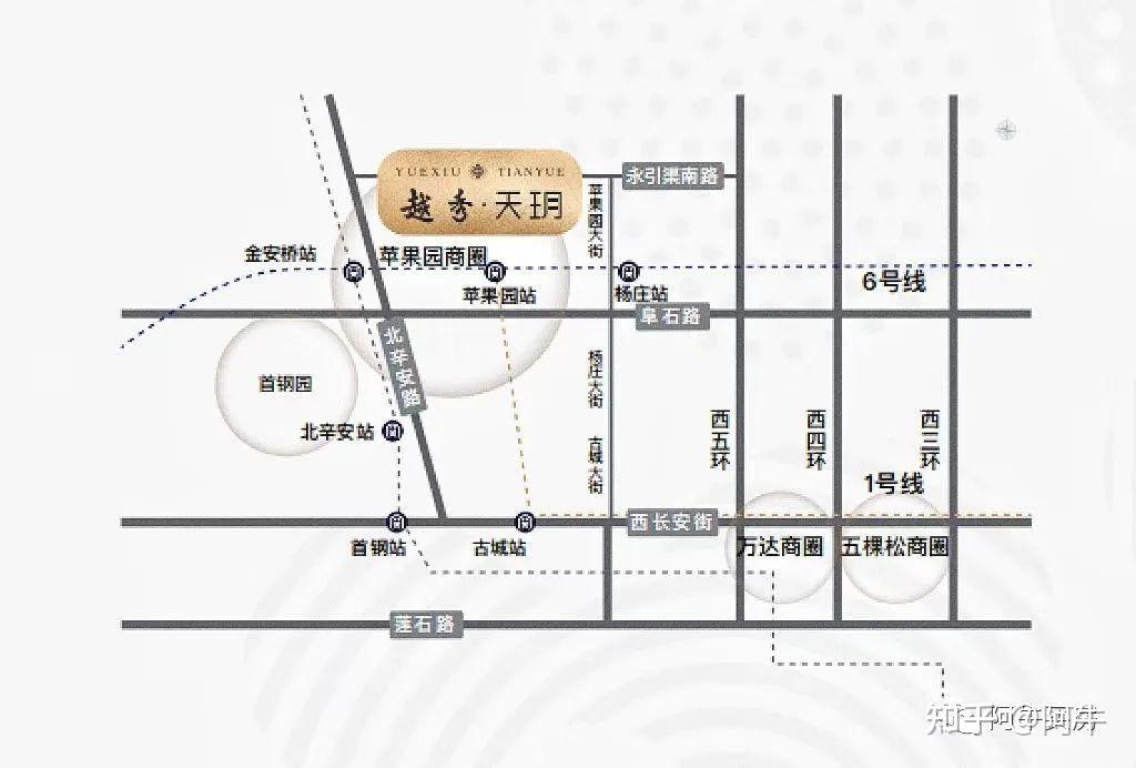 双轨:越秀天玥仅约760m(直线距离)可达6号线杨庄站,仅约980m(直线距离)达三轨交汇的大型交通枢纽站苹果园站,双轨驱动通达全城。