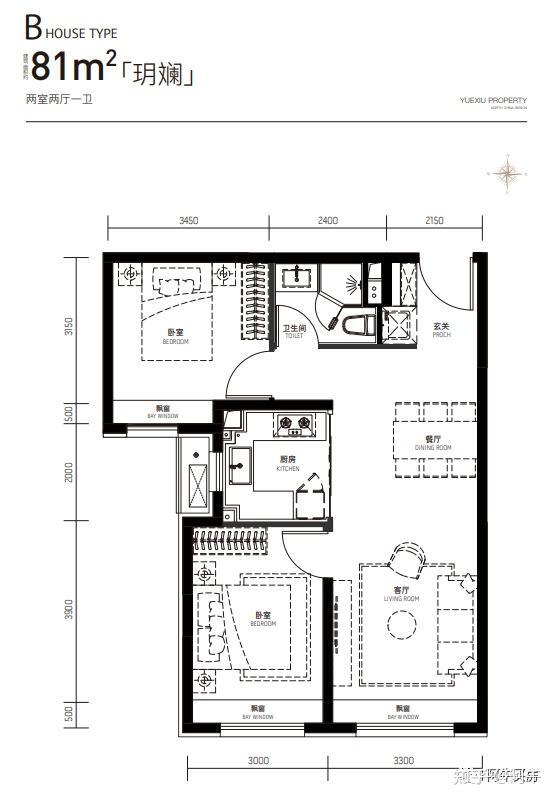 主力户型:B户型 约81㎡ 两室两厅一卫