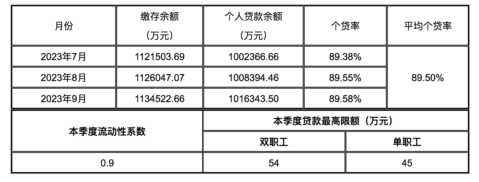 四季度,六盘水市公积金平均个贷率89.50%,住房公积金贷款限额流动性系数为0.9,按照政策,2023年10月7日起申请住房公积金贷款的,单职工家庭申请额度按不超过45万元审批,双职工家庭按不超过54万元审批;10月7日前已签订借款合同的仍按原贷款限额执行。