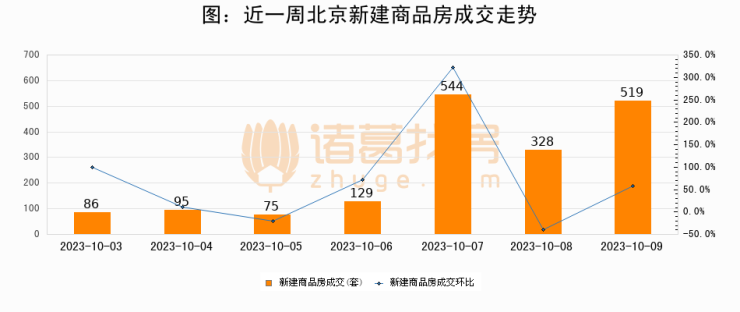 根据北京市住房和城乡建设委员会数据显示,2023年10月09日北京新建商品房成交519套,较昨日增加191套,环比上涨58.2%。近一周北京新建商品房日均成交254套。10月09日单日成交519套,高于近一周平均水平104.3%。