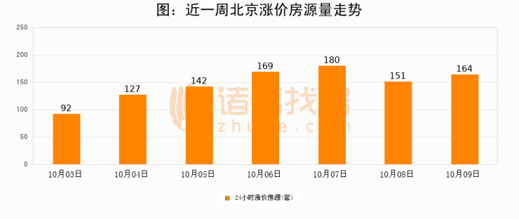 根据诸葛找房数据显示,北京24小时涨价房源量为164套,较10月08日增加13套,环比上涨8.6%。与此同时,涨价房源占比小幅扩大,业主信心有所提升。