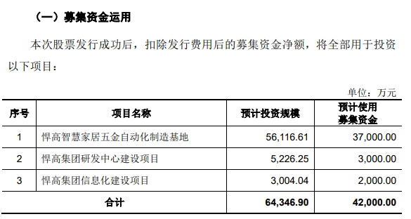 本次IPO,公司拟公开发行股票的数量不超过4001万股,占发行后总股本的比例不低于10%,保荐机构为国泰君安证券。其预计使用募集资金4.2亿元,募资资金将投入悍高智慧家居五金自动化制造基地、悍高集团研发中心建设项目等。