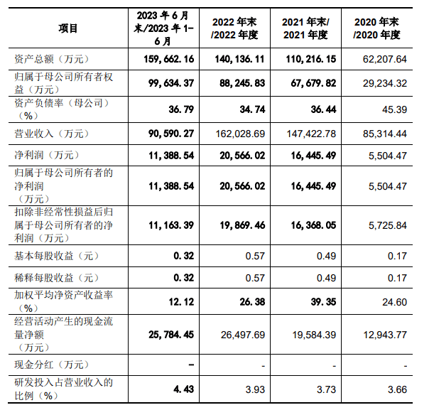 根据最新招股书,2020年至2023年上半年,该公司营业收入分别为8.53亿元、14.74亿元、16.20亿元、9.06亿元,归母净利润分别为5504.47万元、1.64亿元、2.06亿元、1.14亿元。