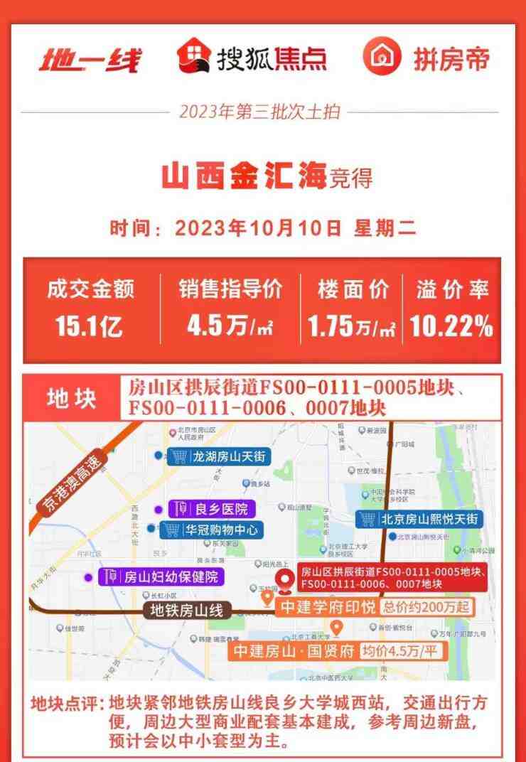 10月10日,北京土拍市场有2宗地块成交。值得一提的是,房山拱辰街道0006等地块吸引了中海、华润、龙湖、山西金汇海4家房企“争抢”,最终由山西金汇海以以15.1亿竞得,溢价率10.22%。价格方面,期房销售指导价4.5万/平方米,现房销售指导价4.7万/平方米。