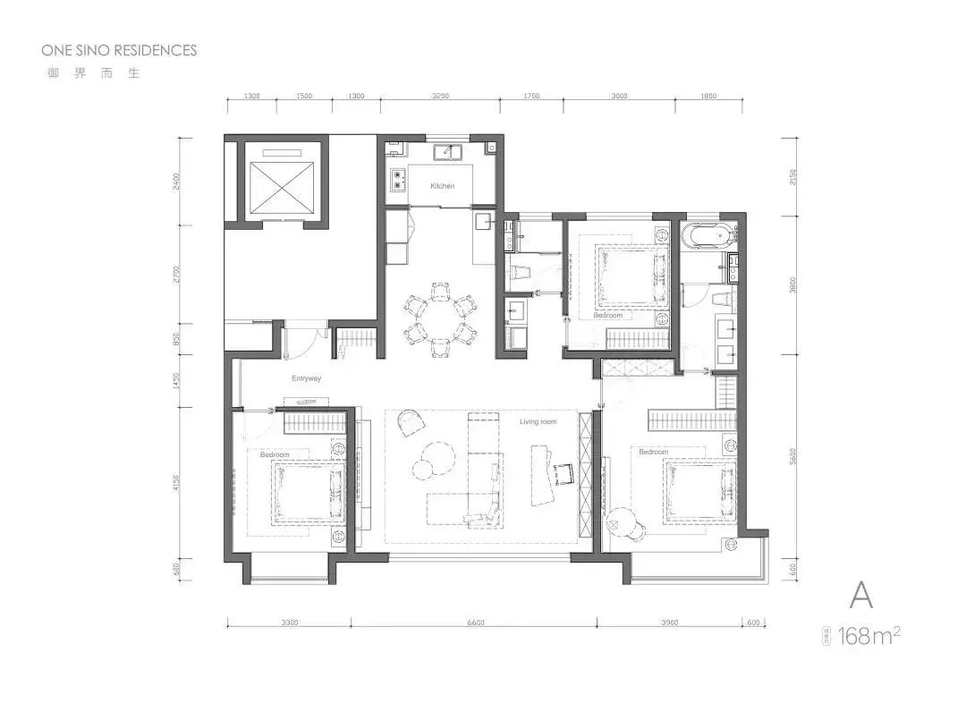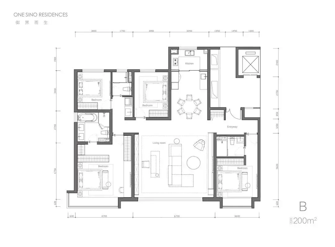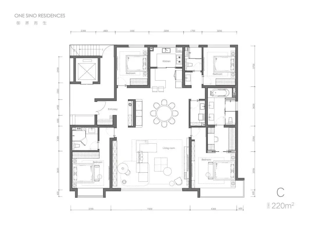四面朝南,总开间尺度近14.4米,宽厅面宽近6.6米——尺度完爆市面200平户型。