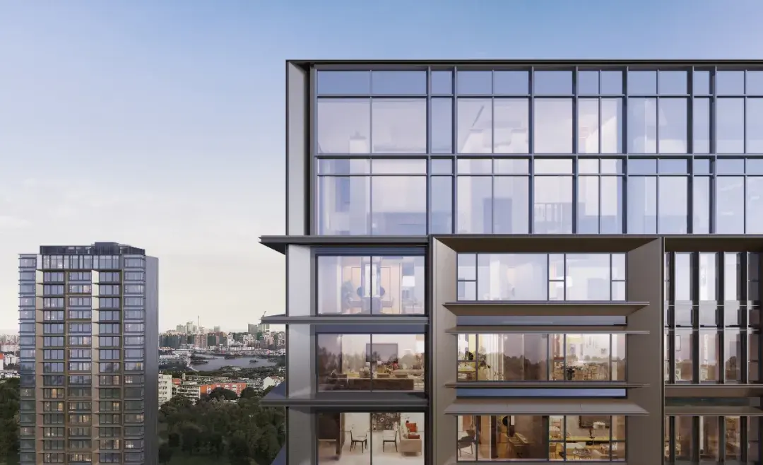 外立面由大落地窗及全合金幕墙组成。建筑菱角分明,极简线条竖向伸展。