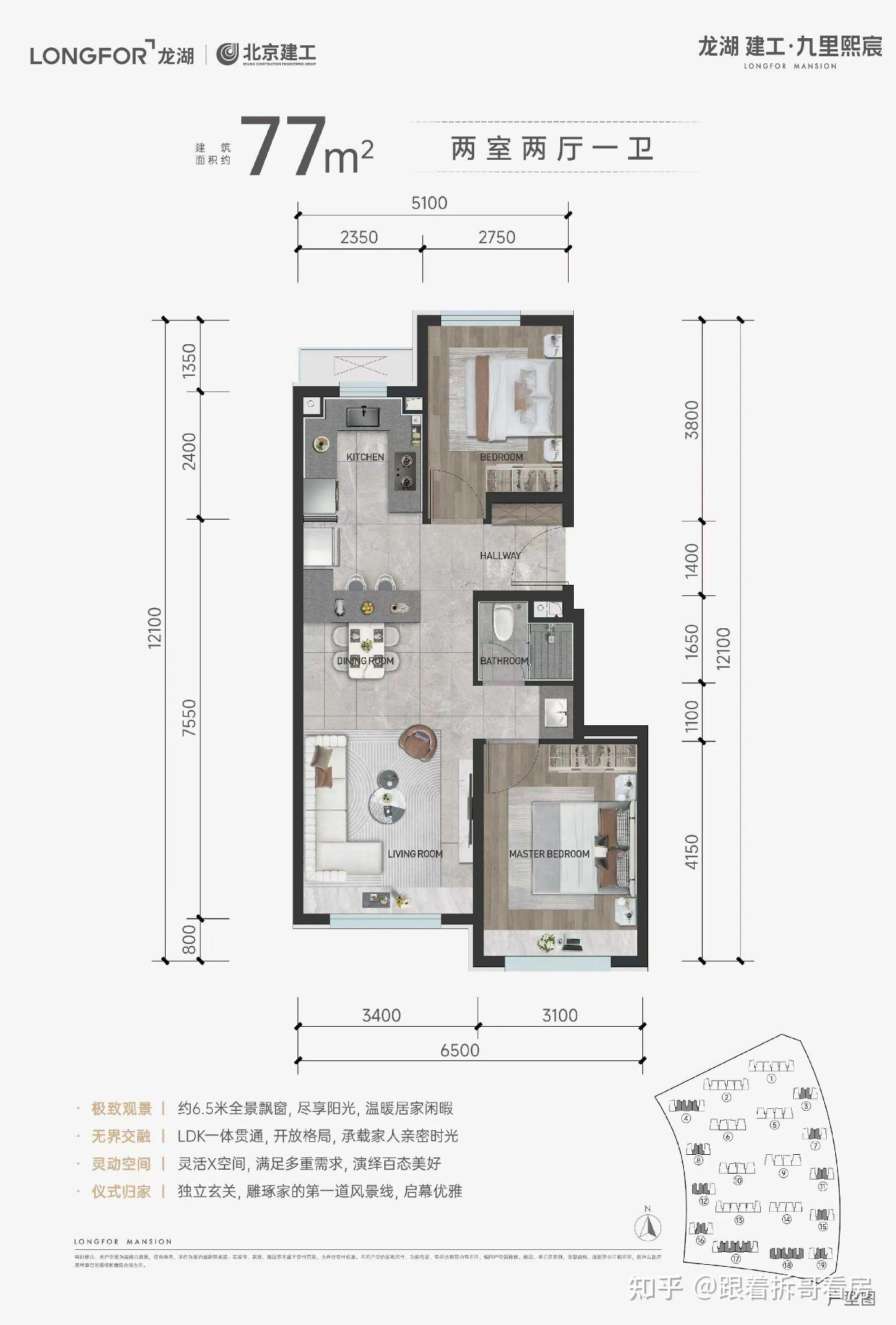 建筑面积约77平的两居,南北通透,南向总面宽约6.5米。这个数值比肩很多 90 平米的项目了。南侧超大全景飘窗,LDK一体化设计,将来住在这,四季和三餐,每户人家都有超宽屏风景。
