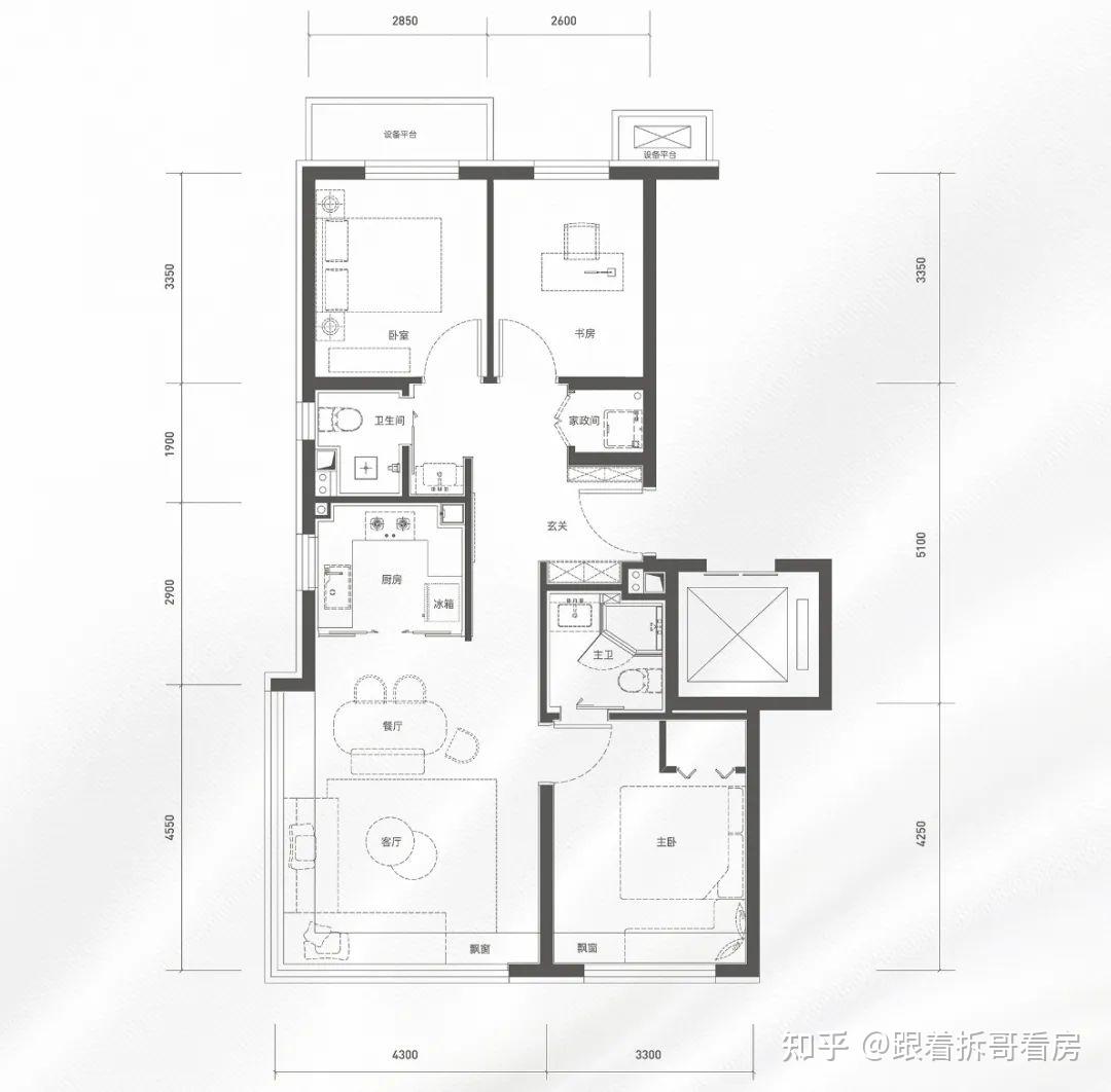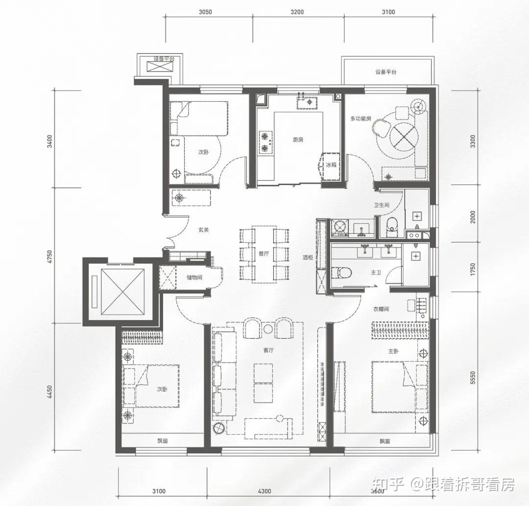 主卧是套房,带独立的衣帽区和卫生间;次卧+多功能房+厨房朝北,次卫干湿分离,空间利用率很高。