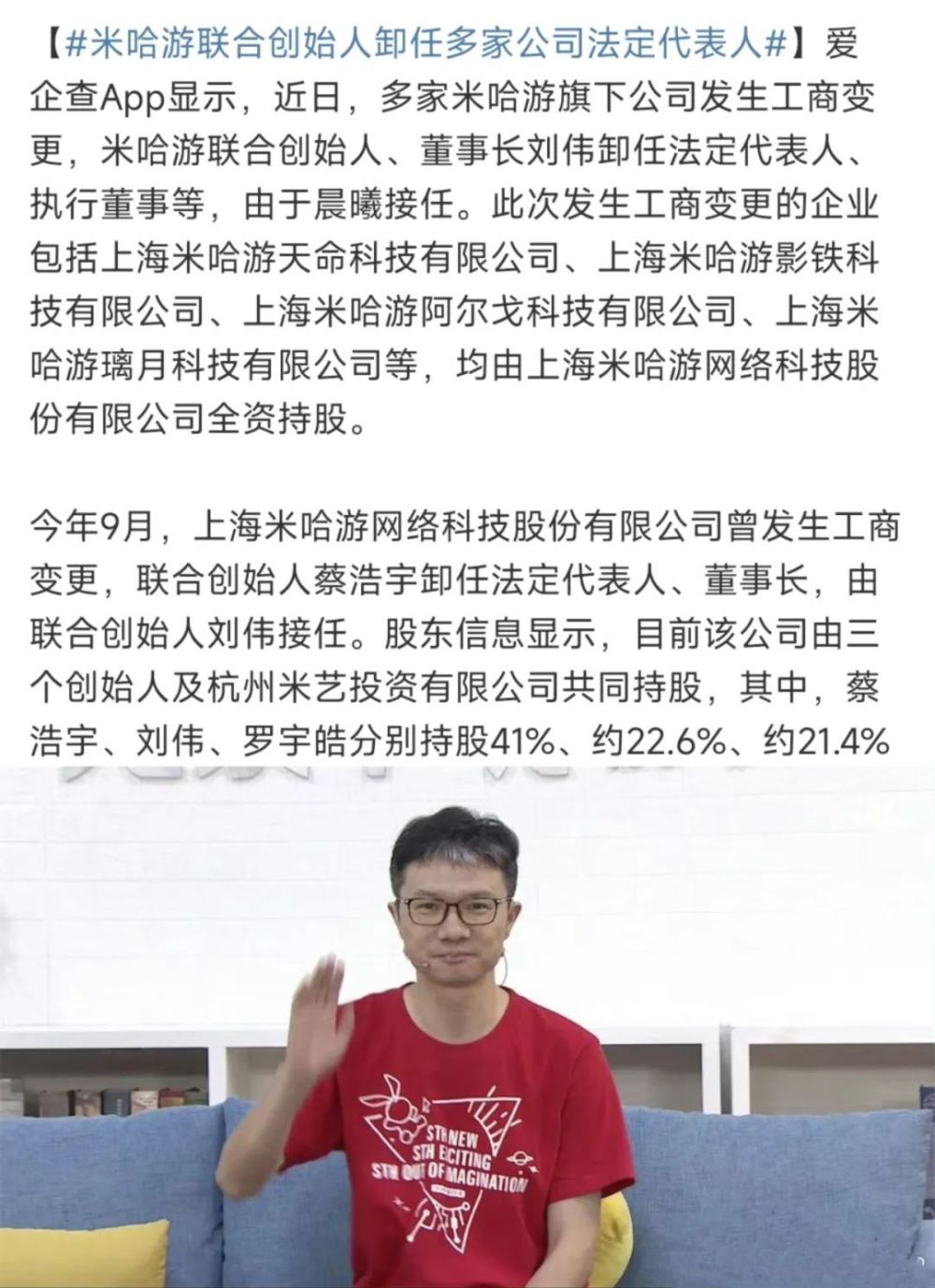 长期以来,蔡浩宇被视为米哈游的灵魂人物,在今年9月退居幕后,由36岁宅男@刘伟——米哈游“最佳辅助”走上前台。然而才一个多月时间,刘伟卸任多家公司的董事长、法定代表人职位,改为于晨曦接任。希望米哈游在于晨曦的带领下能迎来新的发展机遇,并继续在游戏行业中创造出精彩的作品。