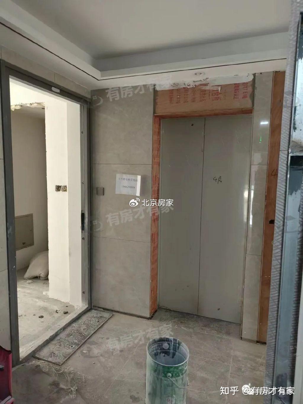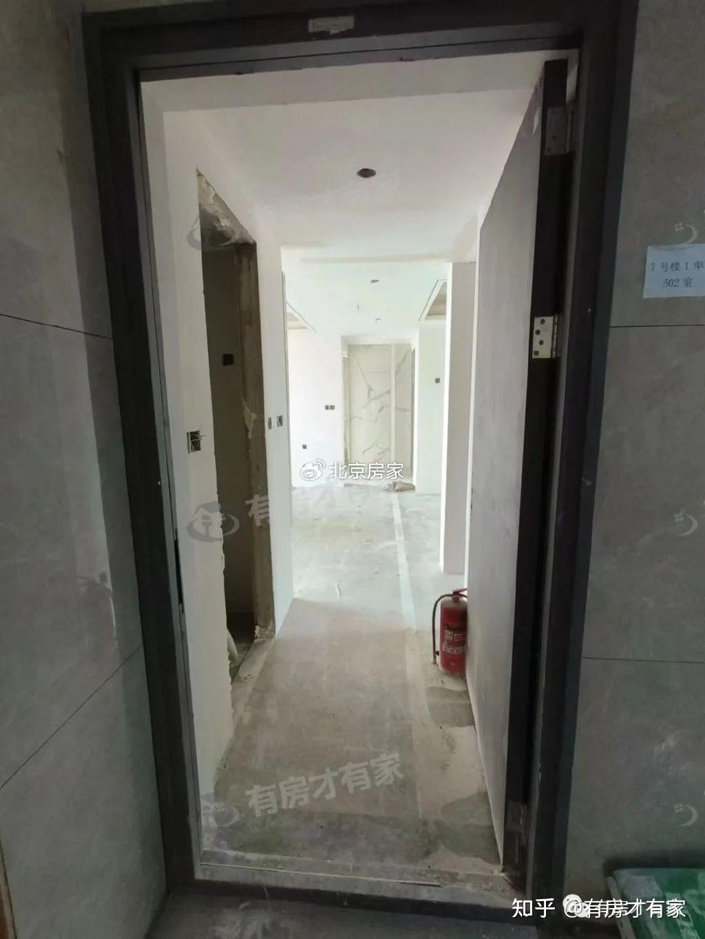 这里是三号楼栋单元西户5层。电梯间和房间门口实拍画面,墙面贴好砖了,我们进去看看吧
