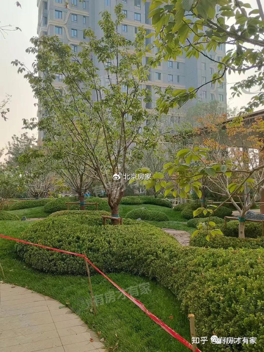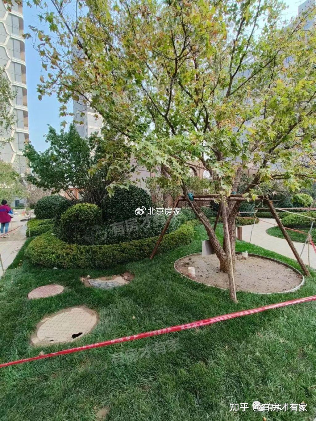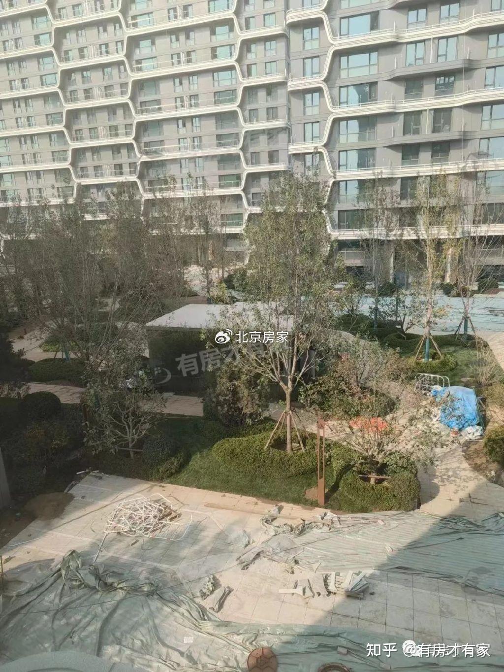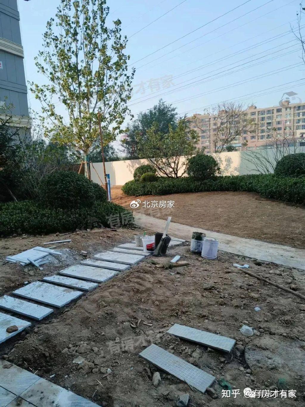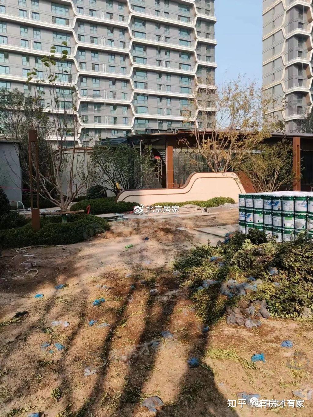 院里绿化建设了一部分,看着还不错;楼前的道路还没清理出来;有的区域还没贴好砖,目前的进度应该就在地面部分了