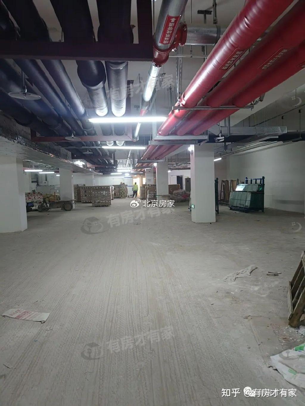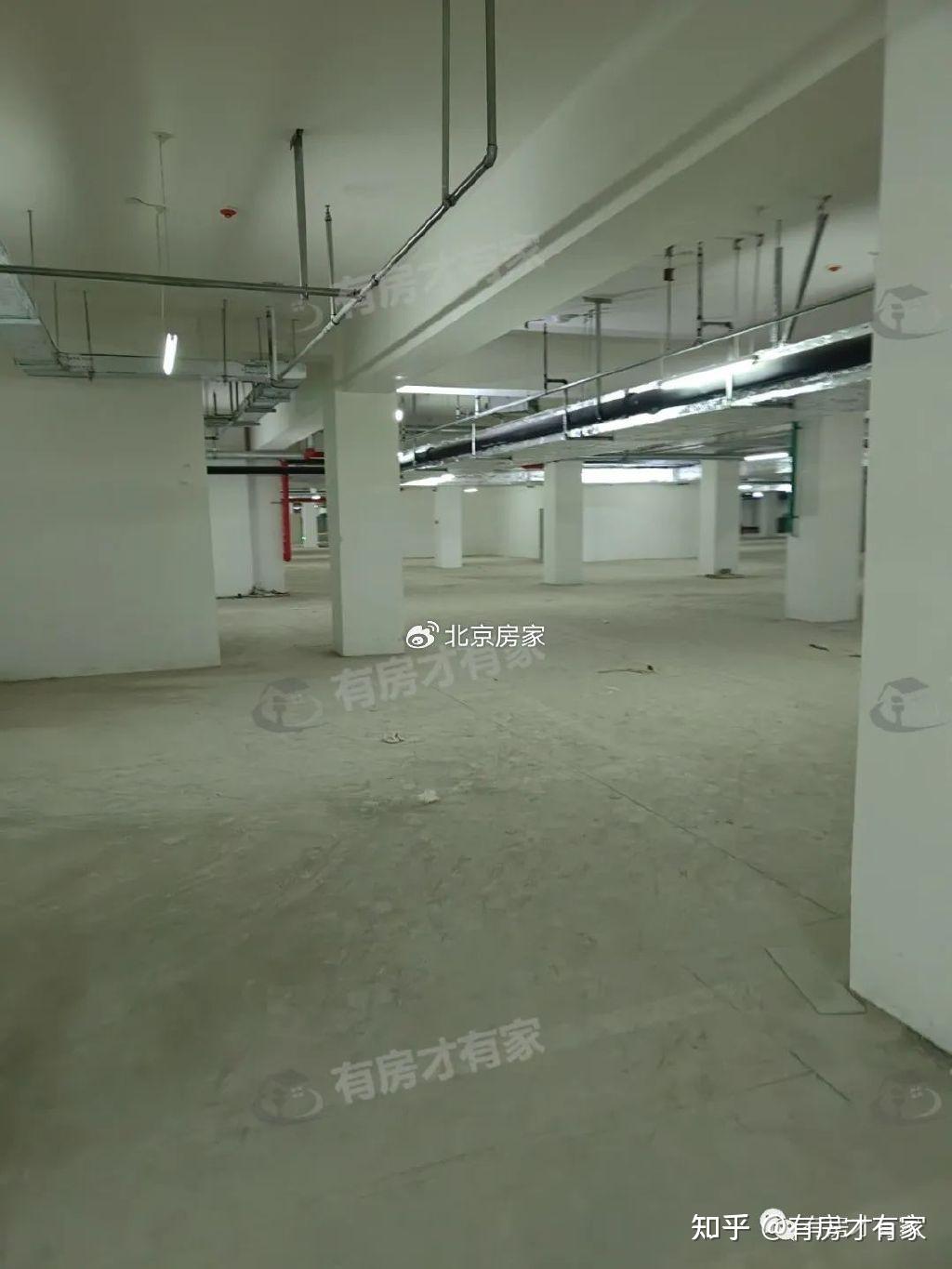 地下室和车库墙面、柱子刷了白漆,地面还没建设好,车位线还没画;车库内部还放置了不少施工建材。