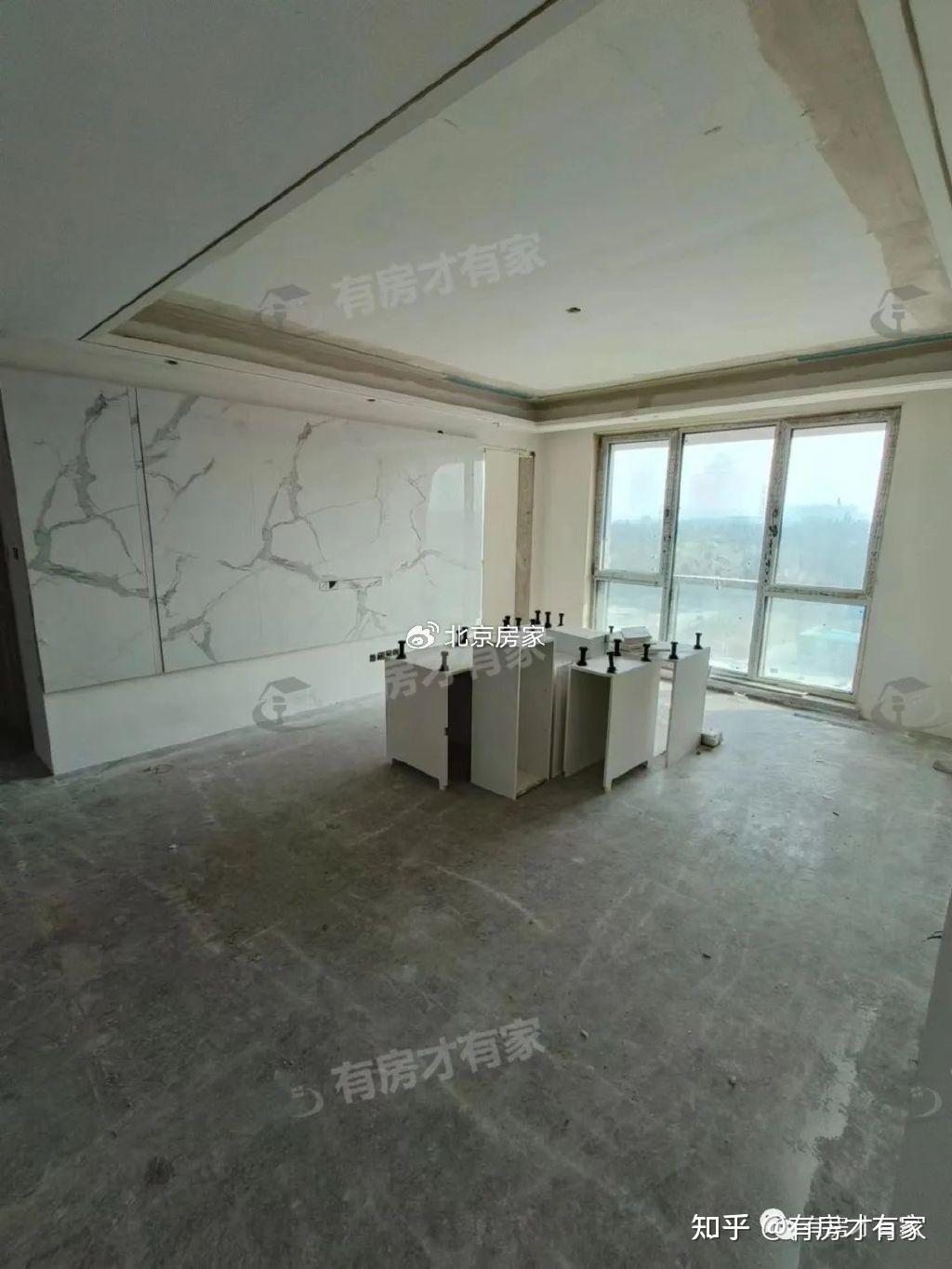 客厅位置电视墙已经做好了,能看到客厅还放着橱柜呢,顶部已经做了吊顶