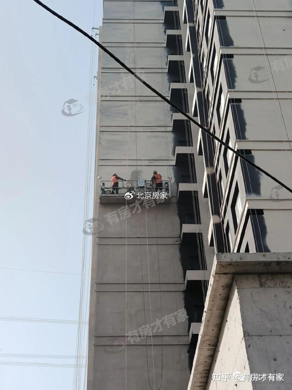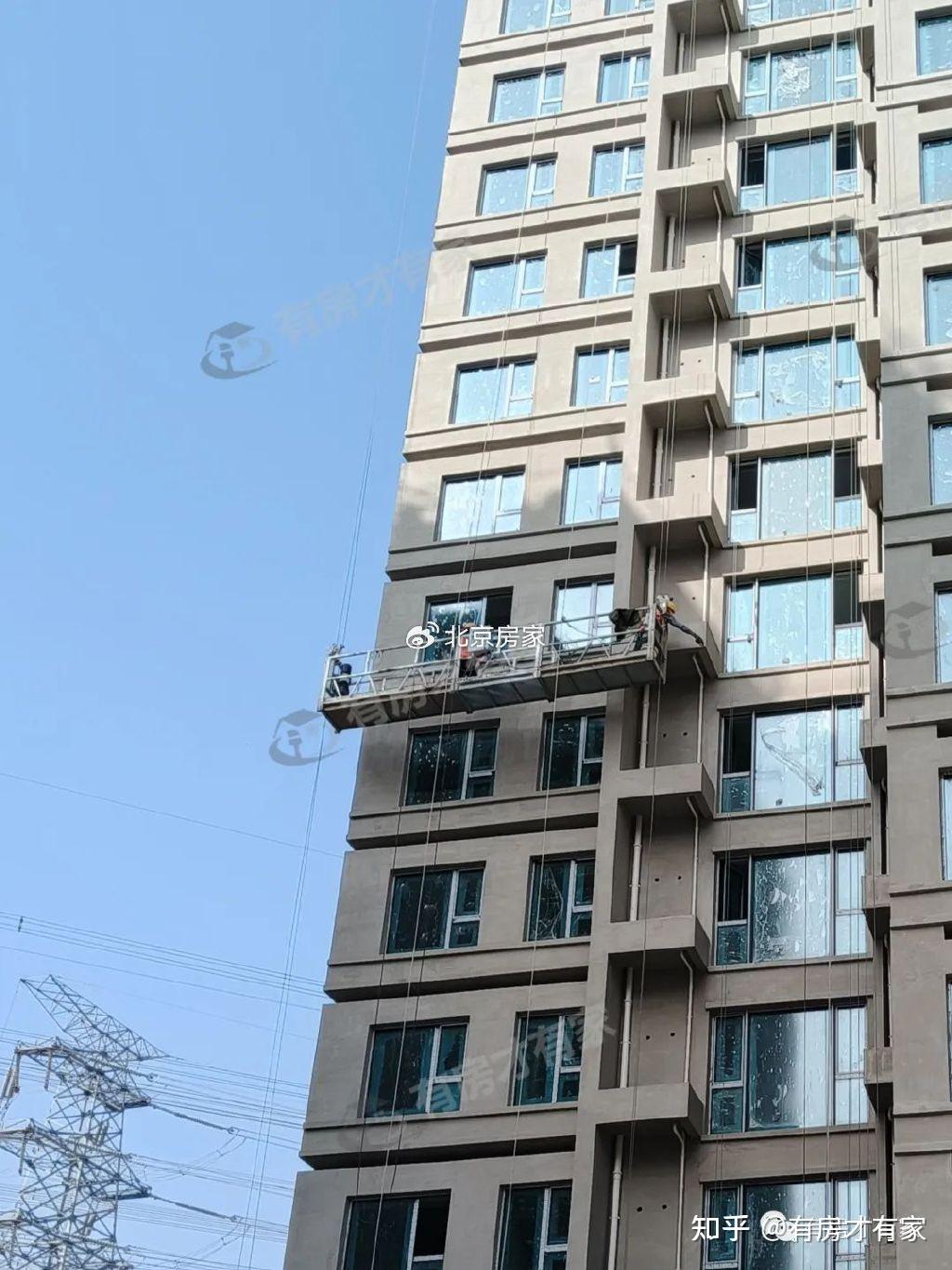 楼栋局部特写,工人们正在进行吊篮平台的施工,还有部分窗户已经安装了窗框
