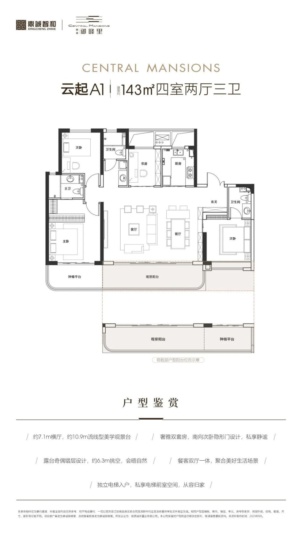 建面约143㎡【云起】户型(偶数层):四居“空中院”领略新高峰。