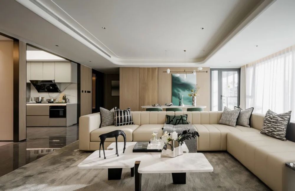 当然,这个户型独特之处,不仅是“空中院”,还在于厨房、餐厅、客厅、阳台“一镜贯穿”,形成南北通透的对视,这是妥妥的LDKG一体化设计,过去一直是大平层产品的专享,却被鼎诚御峰里放在舒适三居室。