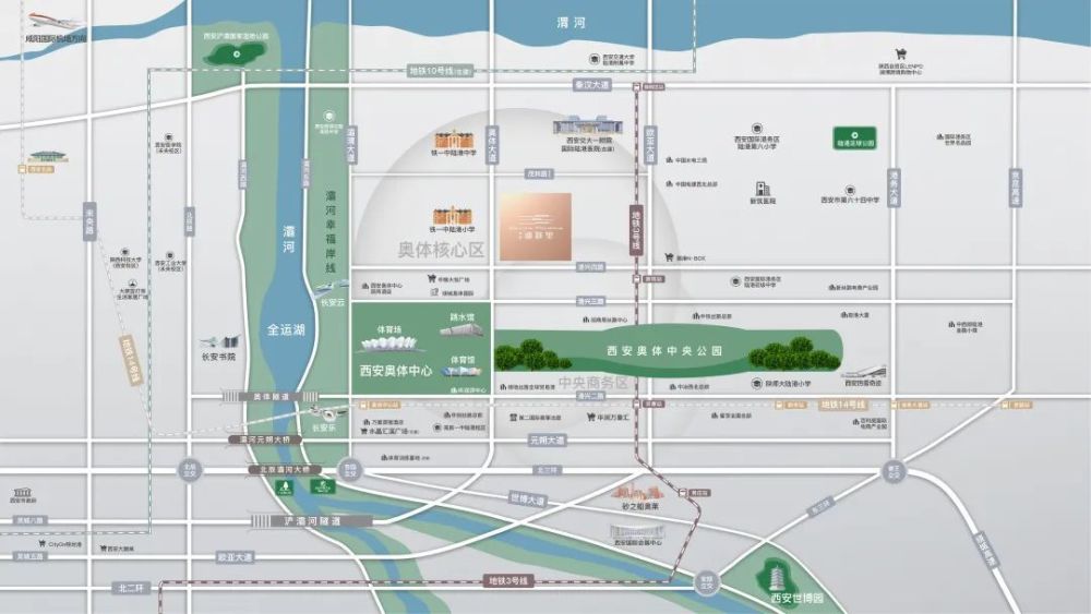 在如此重磅的加持之下,奥体核“芯”区已经汇聚了全球十佳体育场、央企区域总部集群、地铁14号线&3号线、长安云、长安乐、长安翼、超高层写字楼及酒店、万象汇购物中心、约8.17公里的灞河幸福岸线、交大一附院国际陆港医院&国家医学中心、优质名校IP(铁一中、高新一中等)……