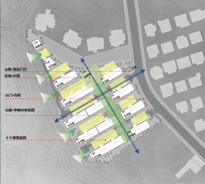 我们来看看印香山到底是怎么做的,规划排布上,印香山福至心灵的向东南方向扭了29°角。