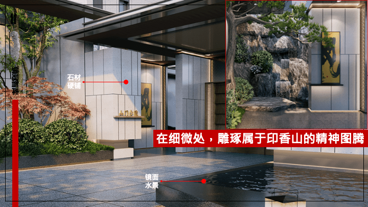 石材做竖向雕琢,底层有一汪波光潋滟的镜面水景,带着一抹禅意,让人能自然地放慢脚步,回到“马上到家了”的情绪场中。