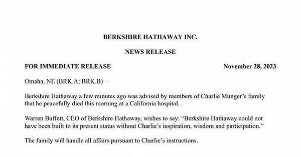 新闻背景:当地时间11月28日,伯克希尔-哈撒韦发布新闻稿称,董事会副主席查理·芒格(Charlie Munger)的家人告知公司,查理·芒格当天早上在加州的一家医院中安详去世。